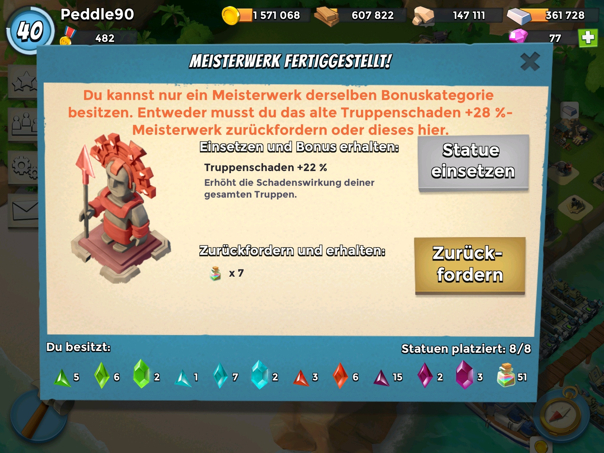 Truppenschaden +26% + 13% | Truppen LP +22% | Beute Boni +48% + 20%+ 19% | 40% + 16% Energie | 65% Kraft durch Steine