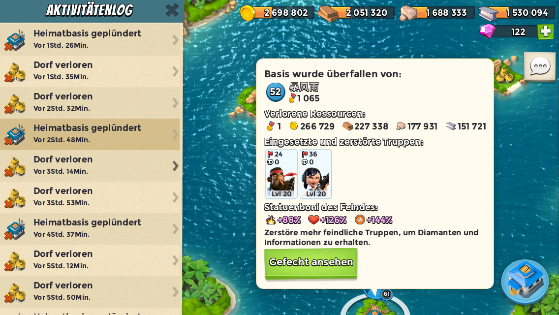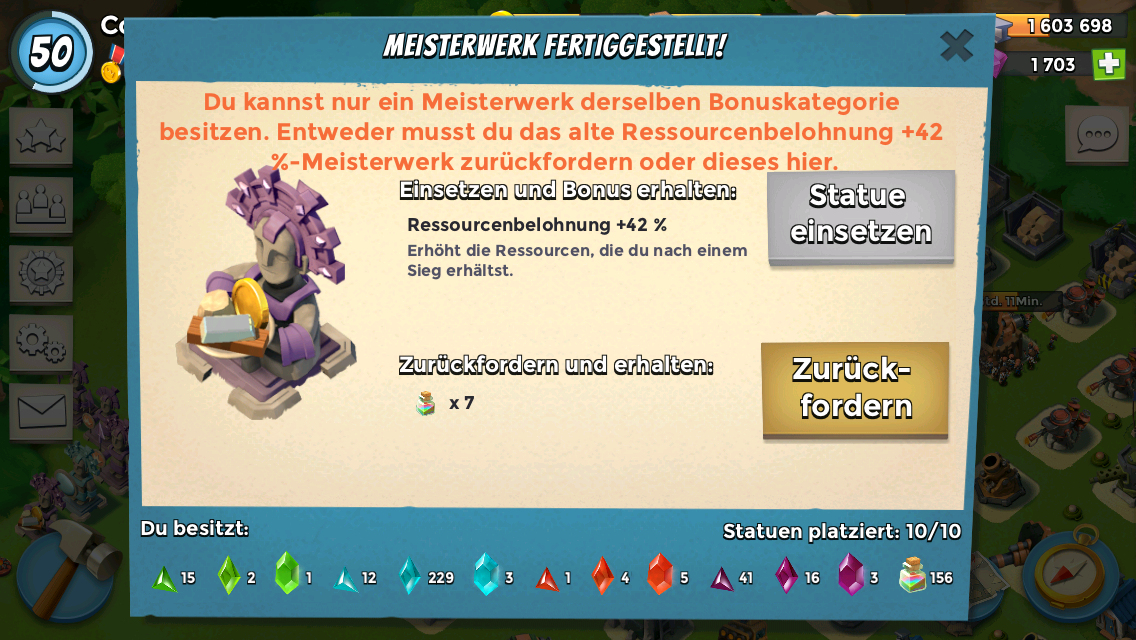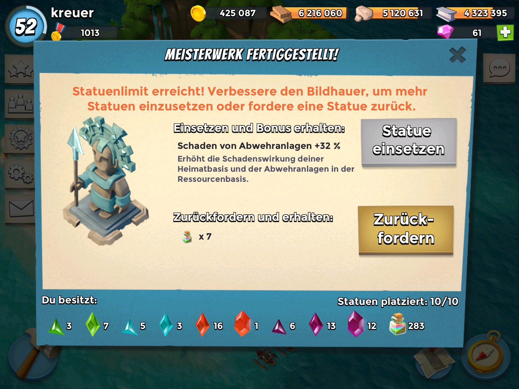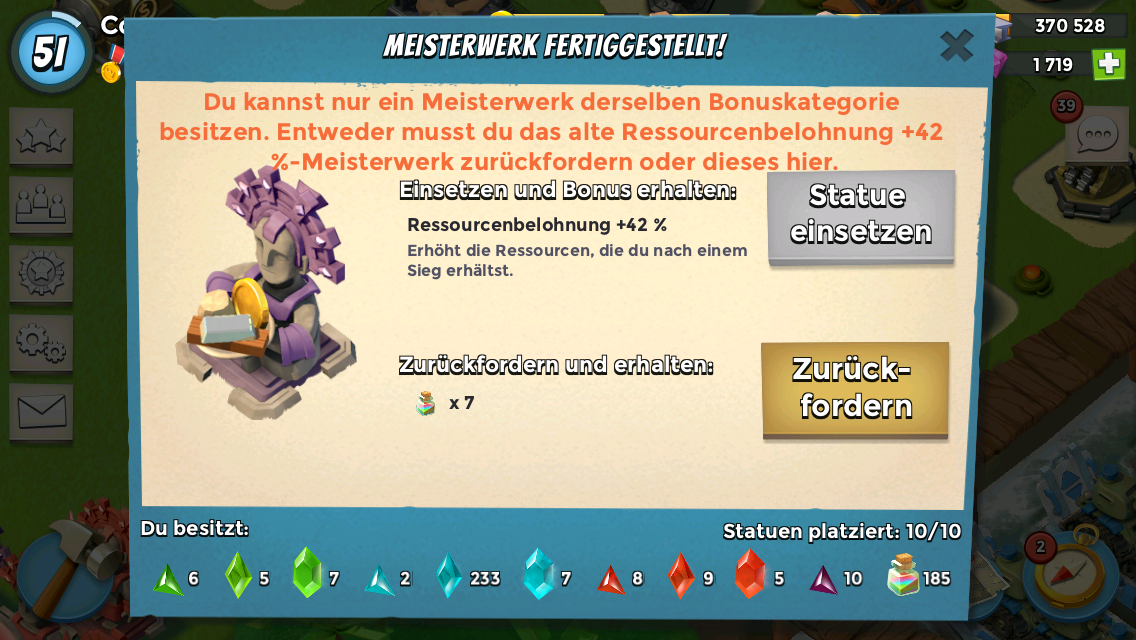 Also angegriffen und fleißig Ressourcen eingenommen. Nachdem der letzte Gegner Platt war habe ich festgestellt, dass ich doch nicht genug Steine habe. Die Lager waren voll. Die Lagkapazität reichte prima für denn Bildhauer auf max, aber eben nicht für zwei große/ größere Updates. So'n Sch...ß aber auch. Lösung: eine Kanone und warten auf die Taskforcebelohnung um ein ausgewogenes Verhältnis Holz Stein Eisen herzustellen.
