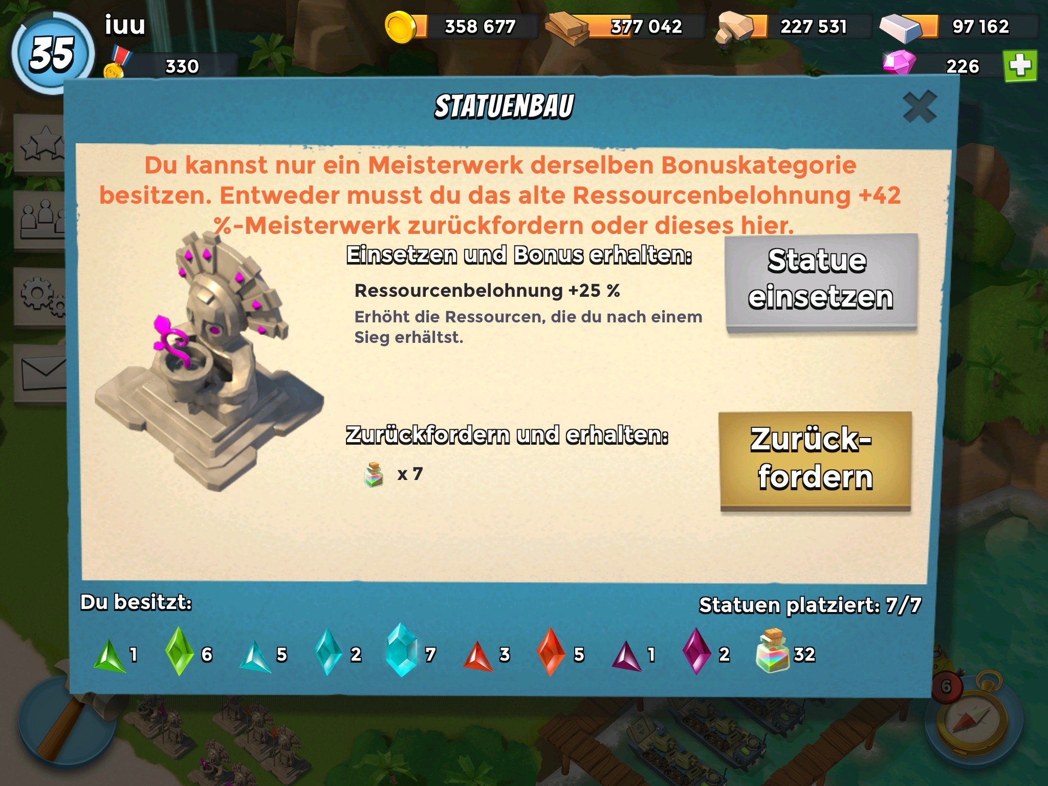 Meiner soll mal eine vernünftige Ressourcenstatue basteln. Habe bisher nur +16%, aber das ist eindeutig zu wenig bisher...