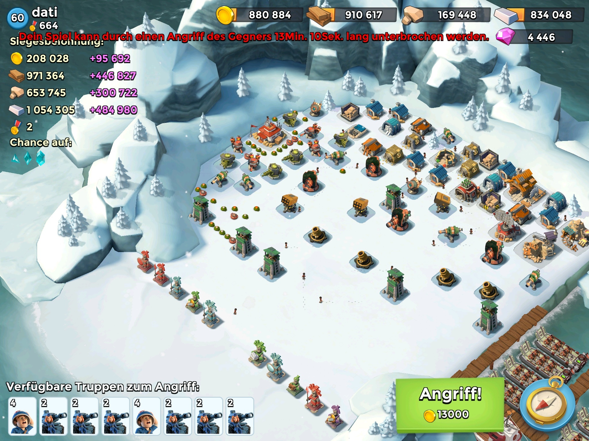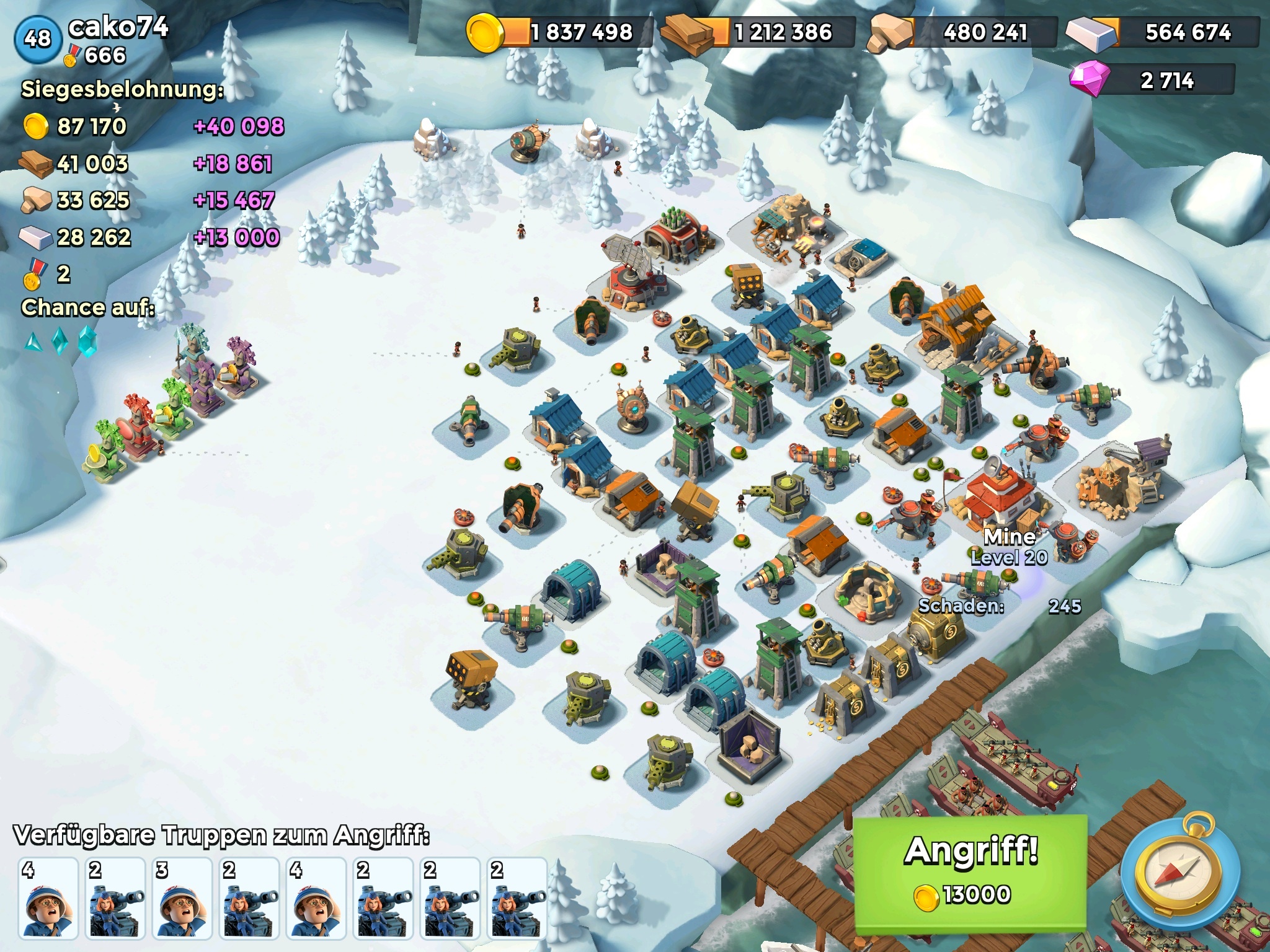 Der ist ja süss.... aber wozu willst du Puder verschwenden? Die Boom macht das Bombardement und 1-2 Kanonen Schuss, die 2 Kanonen kannst du mit 2-3 Kanonenschuss auf den Verbindungspunk erlegen. Die ganz linke Boommiene noch ein Schuss und dann links rein (vorher die 3 Türme). Wenn die Mg und die Kriegergrills weg sind dann noch den 1 Raketenwerfer erlegen Fertig. An den würde ich mich auch jetzt schon mit LV 39, 9 Panzern und 6 Sanis trauen. ![]()