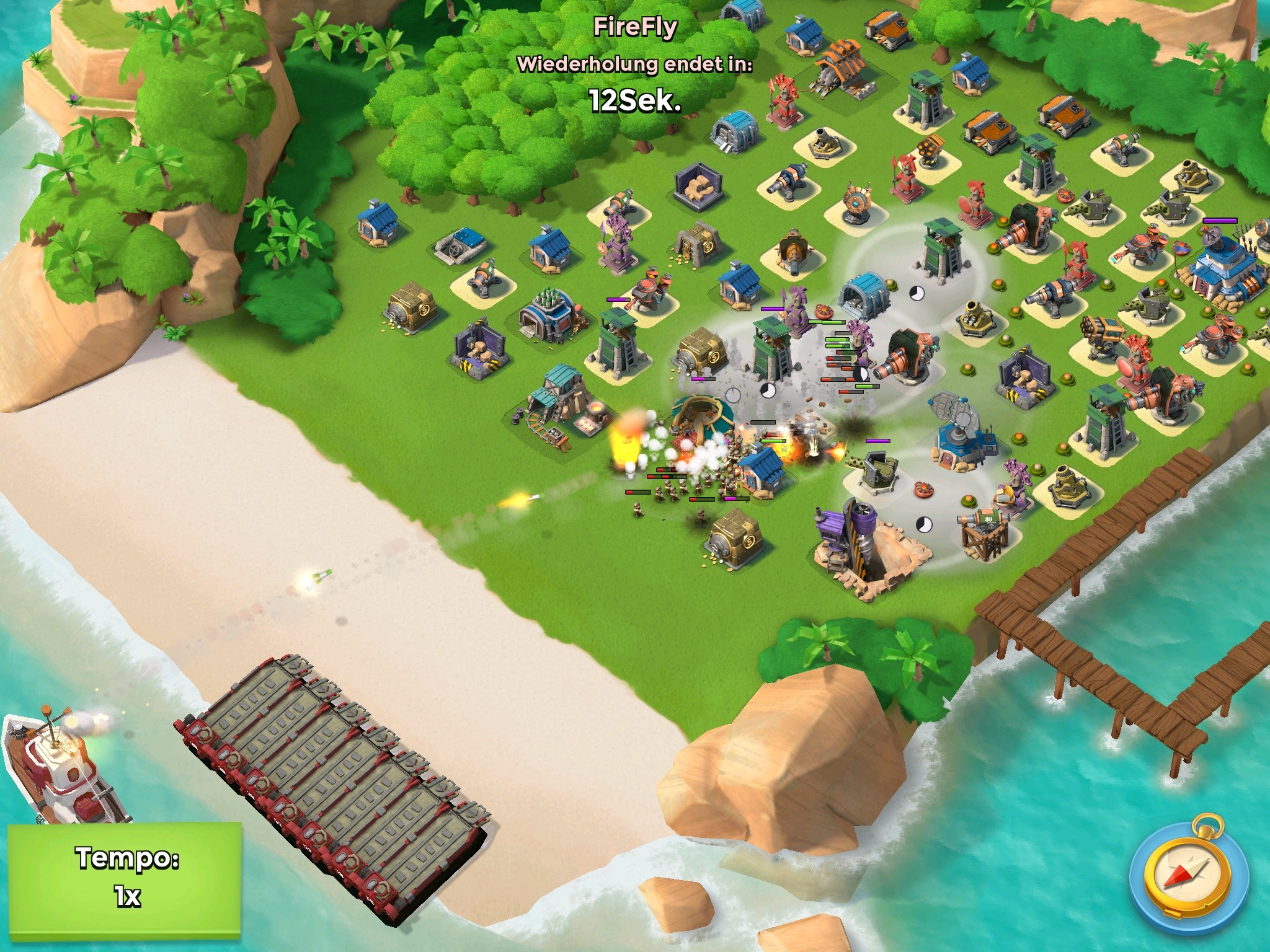 Die am Strand verirrten Ameisen werden meinerseits von Rockets begrüßt, während das Gunboat von FireFly sehr präzise geschossene bombardements auf den wild umherrennenden Ameisenhaufen abgiebt.