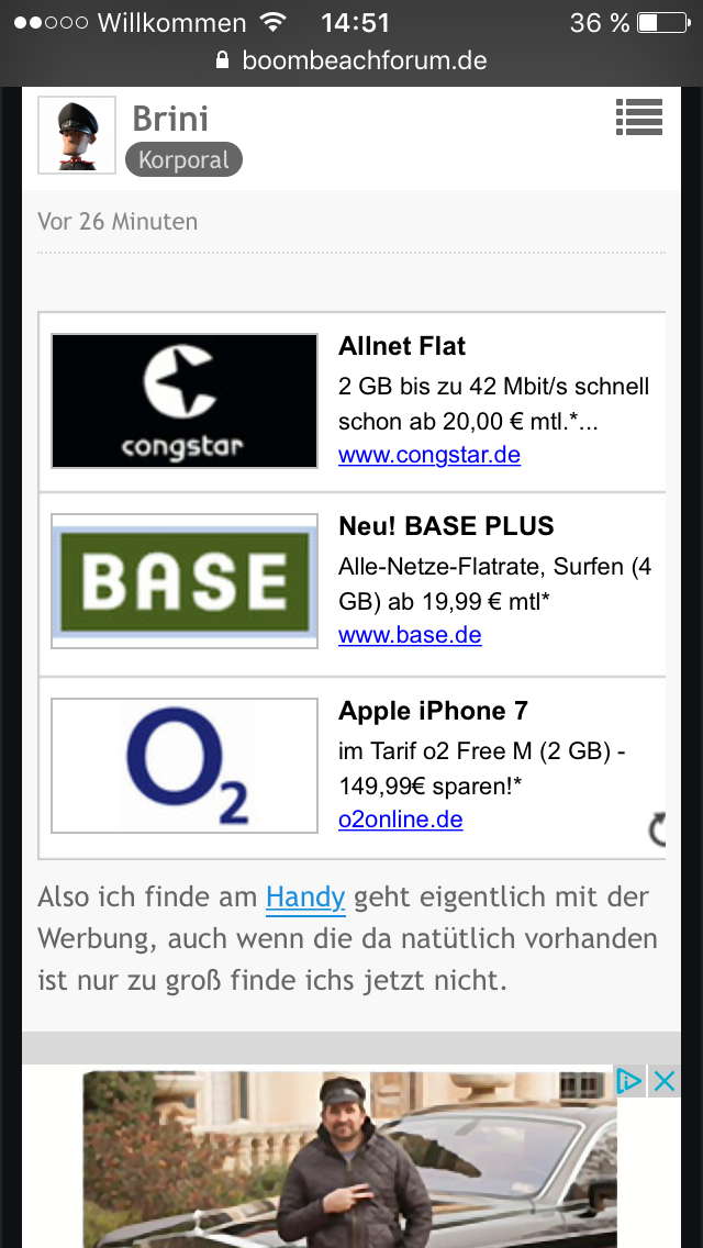 Soviel zur Werbung, da muss man aufpassen das man den eigentlichen Beitrag nicht überließt. Desweiteren kann man Vom Handy (zumindest bei mir) Seiten nur 1vor oder 1zurück wählen, neu aufgerufene Seiten laden in der Mitte, für mich, richtig nervig, auch wenn die Seite dadurch finanziert wird. That's too much ![]()