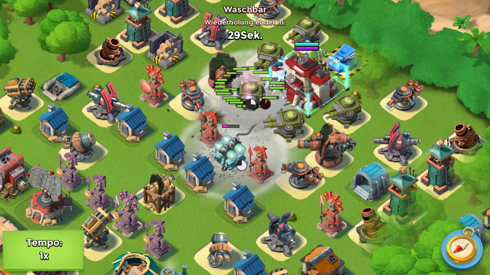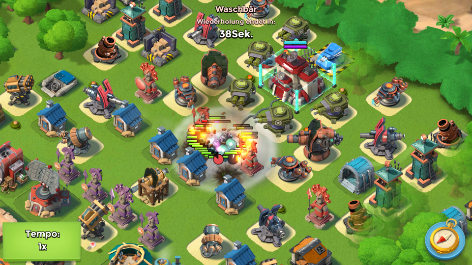 wie auch immer, sein generator hat 57'400 life, meine warris machen mit einem hit 52'480 schaden, nach riese wäre da noch 1 artilleriegeschoss nötig um das ding und dessen besitzer in die ewigen jagdgründe zu befördern. okay ich geb zu hab' 4 warris aufm weg verloren, von mir aus 2 arti, gehüpft wie gesprungen...