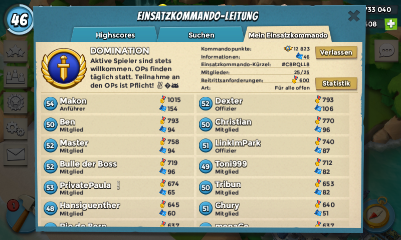 Servus ihr 3, wir sind ein 25er EK namens DOMINATION. Unser Durchschnitt liegt bei 48/49, unser höchster ist 61 und unser niedrigster 44. Wir haben gestern die 10000 kommandopunkte Grenze geknackt und machen momentan Zunderbüchse. Bei uns wird Aktivität groß geschrieben, wer bei der täglichen op mehrmals nicht attacked, fliegt. Uns sind notizen und deren Einhaltung sehr wichtig, momentan sind bei uns 2 Plätze frei, falls ihr Interesse habt kann aber sicher ein weniger aktiver Platz machen