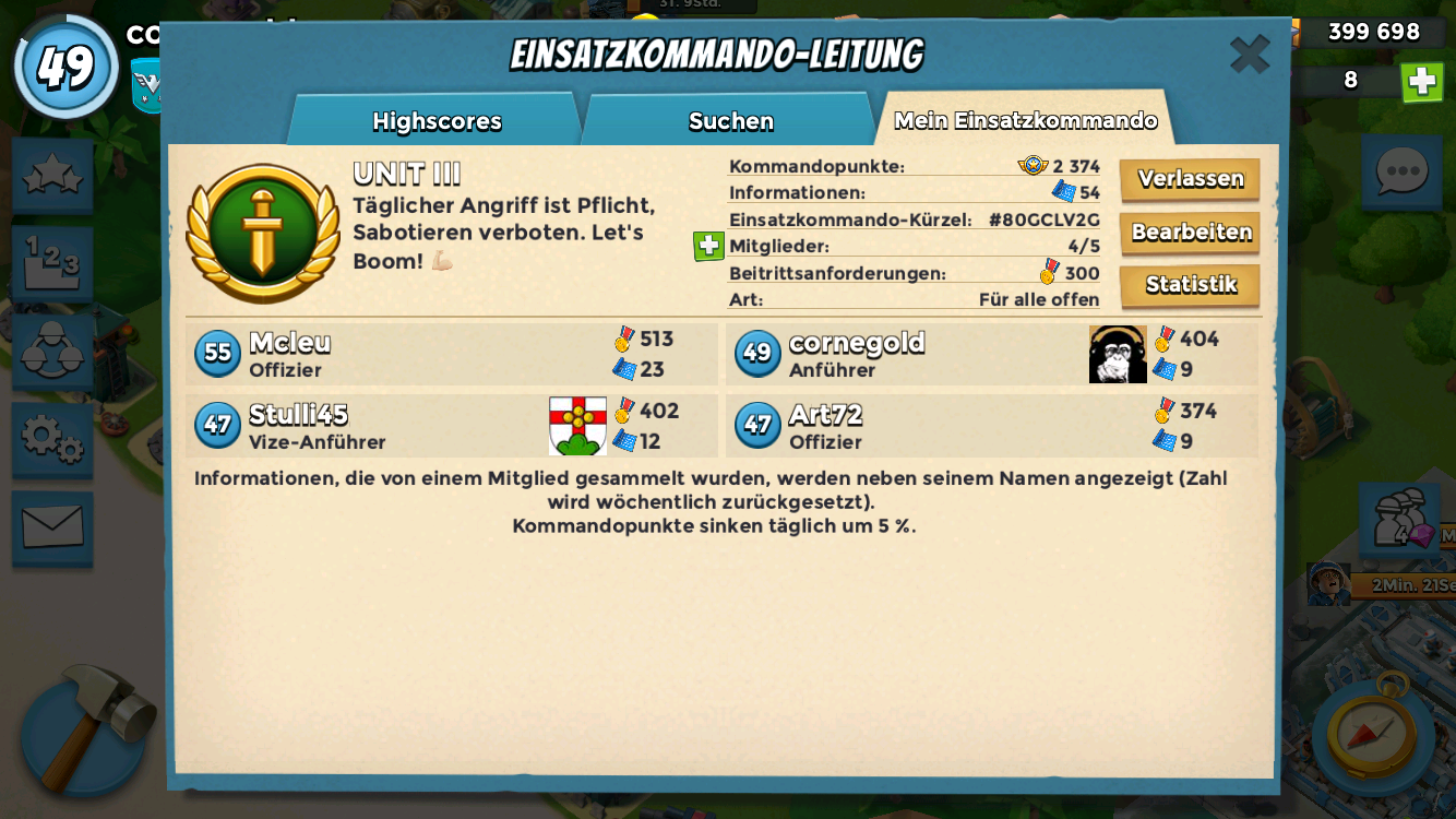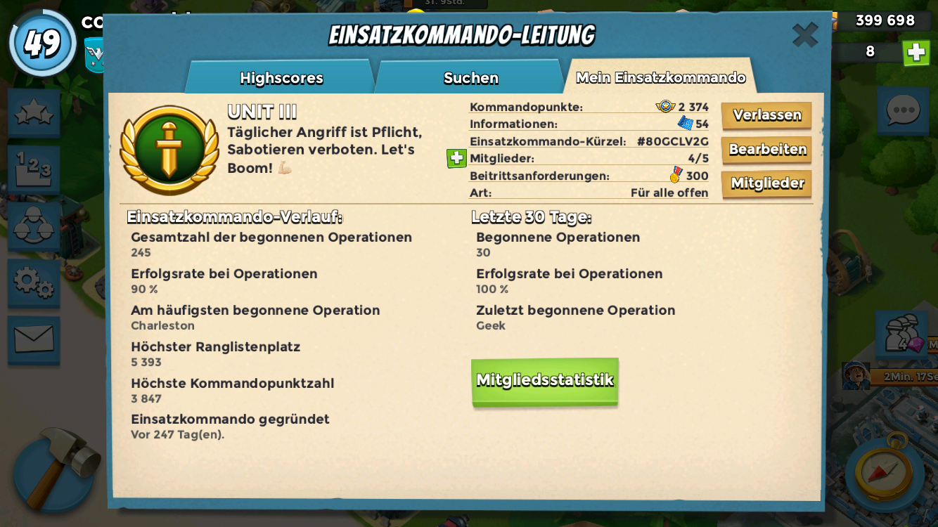 Warum Du gerade der Unit beitreten sollst?Wir sind n cooler Haufen, spielen täglich Missionen und der Spaß steht bei uns immer im Vordergrund. Du passt gut zu uns, wenn Du dir nicht zu fein bist 30 Infos pro Woche zu sammeln und Du passt sogar noch viel besser zu uns, wenn Du taktisch clever agierst und uns hilfst unsere Gegner zu plätten. Kurz zusammengefasst suchen wir nen zuverlässigen Kampfgefährten ab Level 49, der unsre kleine Einheit noch ein wenig erfolgreicher machen möchte.