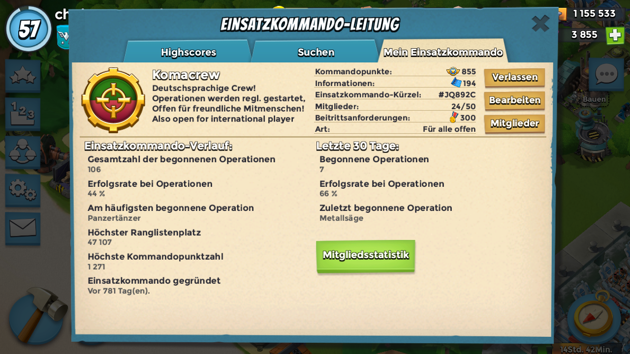 23/50 Mitgliedern. Suchen weiterhin verstärkung. Operationen laufen Wöchentlich angepasst an die Menge der Pläne.