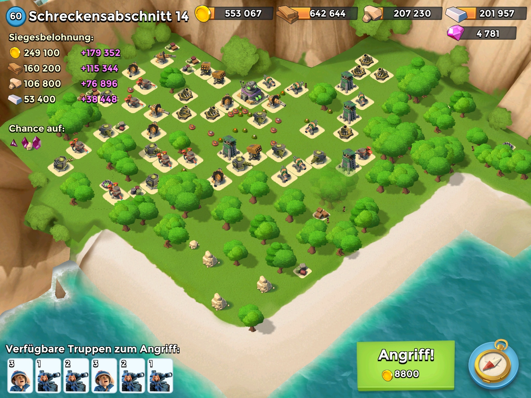Dank meines neuen zusätzlichen Truppenschaden-Wächters ging's heute gefühlt auch ziemlich leicht - hab bis lv 11 gar keine Truppen, und danach nur wenige verloren. Auf Stage 14 hab ich auch irgendwie keinen Bock mehr - zu viele High-Level Booms: