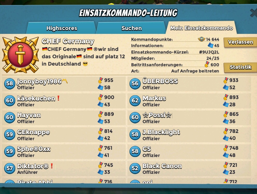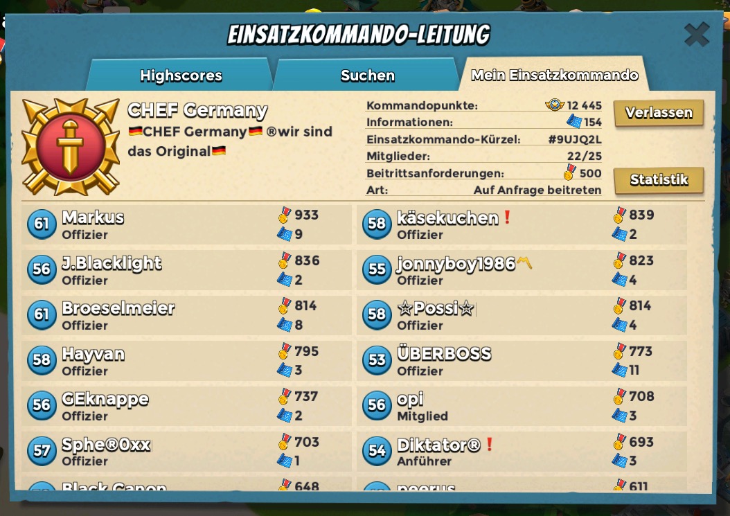 Wenn du auf der Suche nach einem aktiven und erfolgreichem Einsatzkommando bist dann komm zu uns . CHEF Germany . Wir sind täglich aktiv , kommunikativ und einfach ein Mega cooler Haufen bei dem das Gamen richtig Fun macht . Wenn du loyal und aktiv bist sowie dich an abgesprochene Taktiken hältst , bist du bei uns richtig . Schau mal vorbei , unsere TaskForce würde sich freuen .