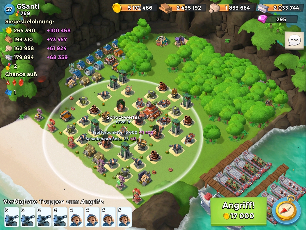 Nochmals, das bringt nichts. Da smokt man sich einfach dran vorbei. Evtl. kann es funktionieren, wenn auch die normalen Gebäude vorne stehen, dann wird es aber sehr eng. Und wenn alles so eng steht, dann ist es ein gefundenes Fressen für die Schockbombe. Wenn du dich doch dafür entscheidest, dann platzier deine Schocker auch so, dass sie den ganzen Strand erreichen. Dann ist der Panzer-Spieler schon fast gezwungen von Beginn an zu smoken. Und evtl. geht ihm dann die GunboatEnergy aus.