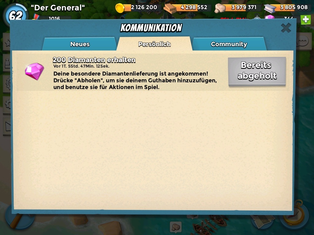 ... das war das erste Mal das ich mich wehement beschwert habe über eigene VERLUSTE ... ich habe nicht darum gebeten mir eine Anzahl an Dias zu "spenden" ... die Antwort von SC war auch klar formuliert, dass sie kein Gold gut schreiben können, welches ich für die Auffüllung der Boote verloren habe, allerdings als Entschädigung EINMALIG 200 Dias gegeben haben.