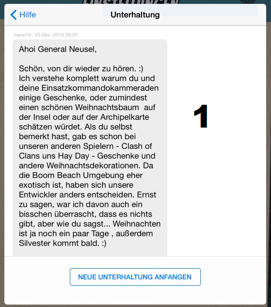 Für die Spieler von Hay Day wie auch CoC gab es ein kleines Weihnhachtsgeschenk in welcher Form auch immer ... nur die BB Spieler gingen bis dato leer aus. Dies habe ich muniert und u.a. Antwort (Bild 1) erhalten