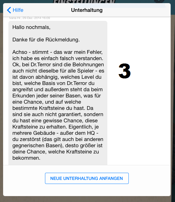 Hier ging es um die Beantwortung der Frage ob bei allen die Ausbeute an Kraftsteinen beim Doc gleich sind, da viele im EK andere Erfahrungen gemacht haben (Auch im gleichen Level). Unten die erstaunliche Antwort die von SC eigentlich, auf andere Anfragen und im offiziellen Forum, anders beschrieben wurde. Wichtig die Aussage bzgl. Zerstörung der Gebäude ... siehe Bild 3
