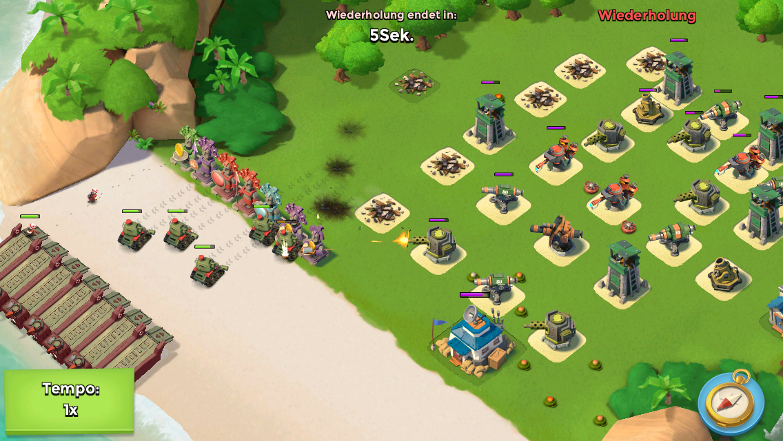Freu dich nicht zu früh: demnächst kommen Panzer vorbei und da kannst du momentan gar nichts machen bei deiner Basis. Später kommen dann Panzer mit heilenden Sanitätern vorbei...