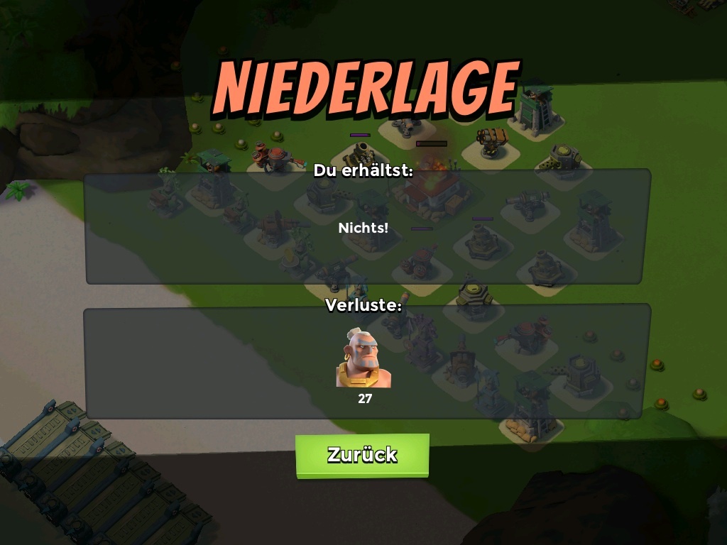 Den ganzen Abend bin ich dran, die Ressourcen für Bildhauer 5 zusammen zu raiden. Hab nur Gegner mit beschissenem Loot, hoch gelevelter Defense und bei den XPs ca. 5-7 Level über mir. Doc gespielt, OP belohnung abgeholt, die Basen für Hooka erlegt, aber dann... Dann hab ich nur noch basen für Warrior Rush. Ich krieg die Basen zwar klein, aber ich hab fast immer zuerst einen Totalverlust. Doch dann: es fehlen nur noch 40k Eisen. Ich stocke die LCs wieder auf für den letzten Raid. 30 Sek. vor Abfahrt wird mein Spiel durch einen Angriff unterbrochen...