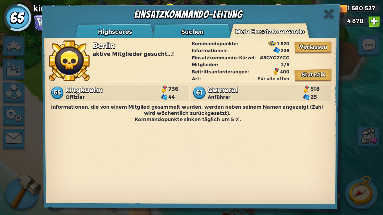 Kürzel: #8GYG2YCGWir sind aktuell nur zu zweit, Infos sind jeden Tag voll und wir starten auch täglich eine OP aber zu zweit kann man halt nur begrenzt das starten was man gerne starten wollen würde, da alles über "geh aufs Ganze" mehr als 2 KOmmandobasen hat...